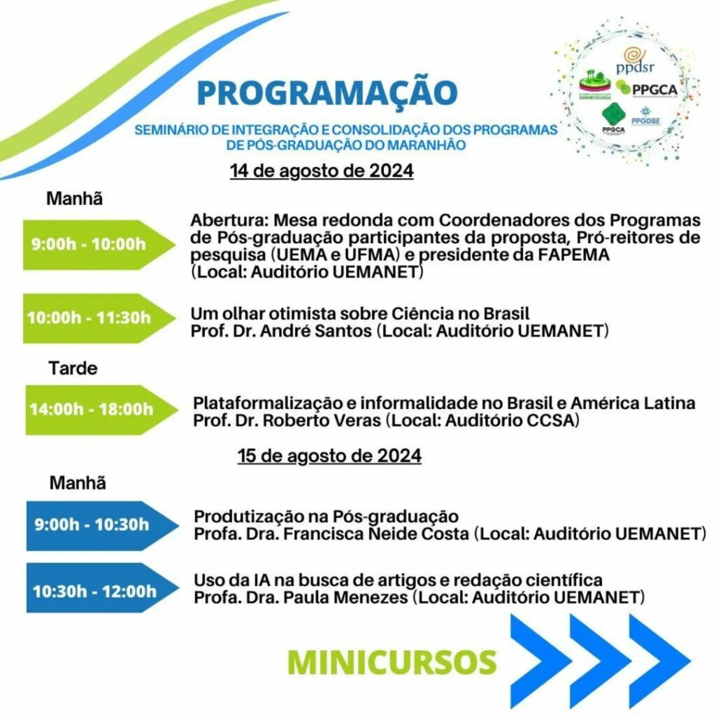 A Universidade Estadual do Maranhão (Uema) e a Universidade Federal do Maranhão (UFMA) promovem, nos dias 14 e 15 de agosto, o Seminário de Integração e Consolidação dos Programas de Pós-Graduação do Maranhão com o tema “Inovação e sustentabilidade para o desenvolvimento socioeconômico: integrando ciência e sociedade”.