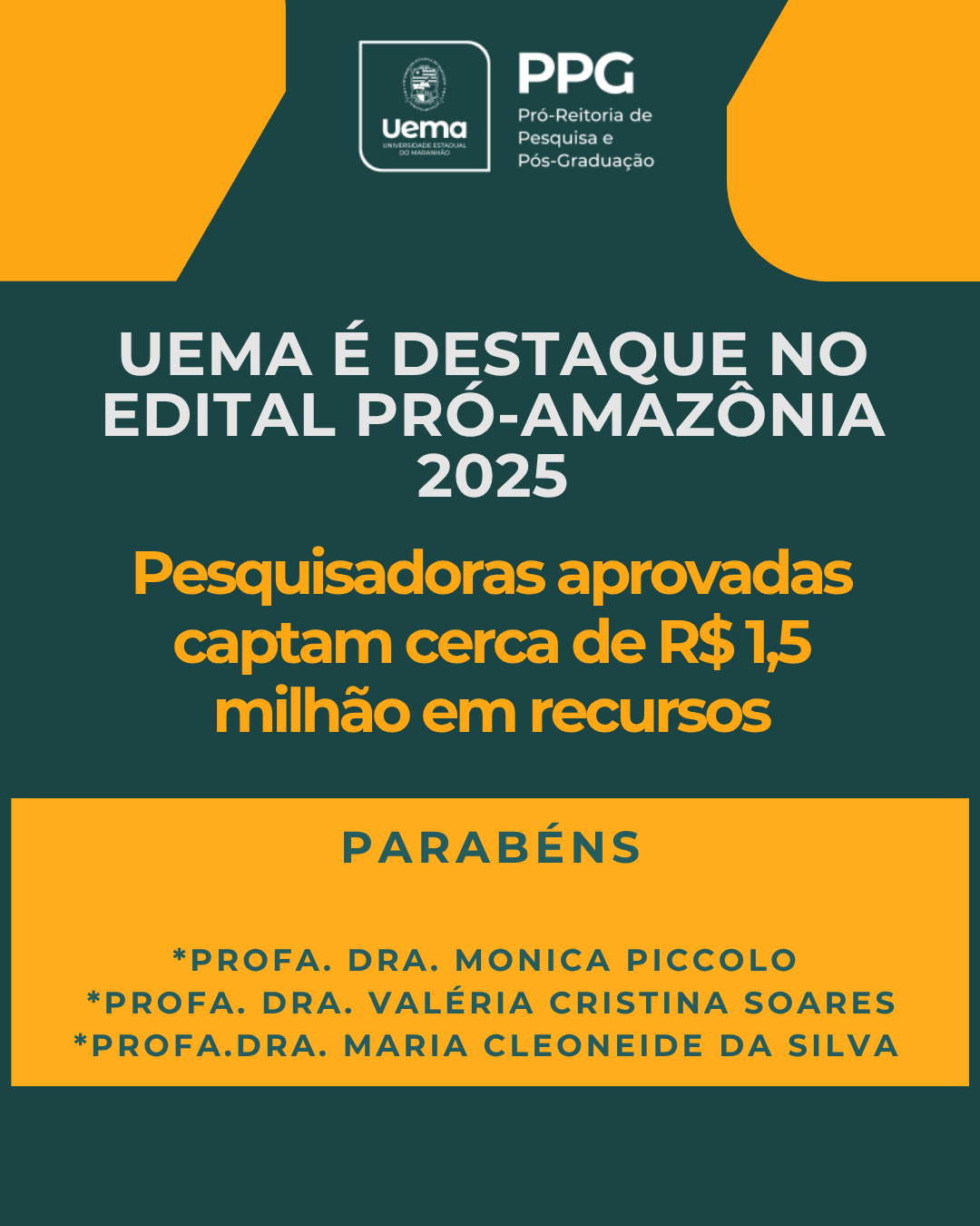 Para o Pró-reitor de Pesquisa e Pós-Graduação da Uema, Marcelo Cheche, o desempenho da instituição neste edital evidencia o fortalecimento da pesquisa científica no estado. “Antes de tudo, quero parabenizar as três pesquisadoras pela conquista. Esse resultado reforça o compromisso da Uema com a excelência na pesquisa. O valor captado para projetos de alta relevância socioambiental ultrapassa um milhão de reais. Esse resultado reforça o compromisso dos nossos pesquisadores com essas pautas, que são fundamentais para o desenvolvimento sustentável da região”, destacou o pró-reitor.