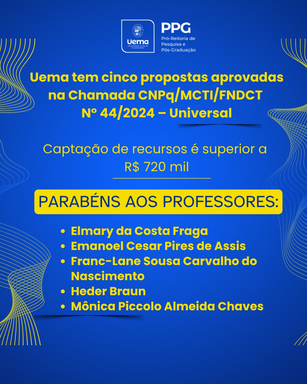 A Universidade Estadual do Maranhão celebra mais uma conquista acadêmica com a aprovação de cinco propostas de pesquisa na Chamada CNPq/MCTI/FNDCT Nº 44/2024 – Universal, totalizando R$ 728.182,60 em recursos captados. A iniciativa tem como objetivo apoiar projetos que contribuam para o avanço científico, tecnológico e para a inovação do país, abrangendo todas as áreas do conhecimento.