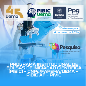 A Pró-Reitoria de Pesquisa e Pós-Graduação – PPG da Universidade Estadual do Maranhão – UEMA, em parceria com a Fundação de Amparo à Pesquisa e ao Desenvolvimento Científico e Tecnológico do Maranhão – FAPEMA e com o Conselho Nacional de Desenvolvimento Científico e Tecnológico – CNPq, e em conformidade com a Resolução n.º 1295/2017-CEPE/UEMA, torna público o presente Edital para: i) seleção de projetos de pesquisa, planos de trabalho e orientadores no âmbito do Programa Institucional de Bolsas de Iniciação Científica – PIBIC/UEMA; ii) concessão de bolsas de Iniciação Científica financiadas pelo CNPq (incluindo CNPq-AF), FAPEMA e UEMA; e iii) concessão de cotas voluntárias no âmbito do Programa Institucional Voluntário de Iniciação Científica – PIVIC/UEMA, para o ciclo de setembro de 2026 a agosto de 2027, nos termos e condições estabelecidos neste Edital.
